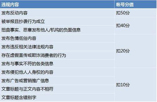1. 内容违规:这可是扣分的大头。比如,发布违法违规内容、虚假信息、低俗内容等,轻则扣分,重则封号。